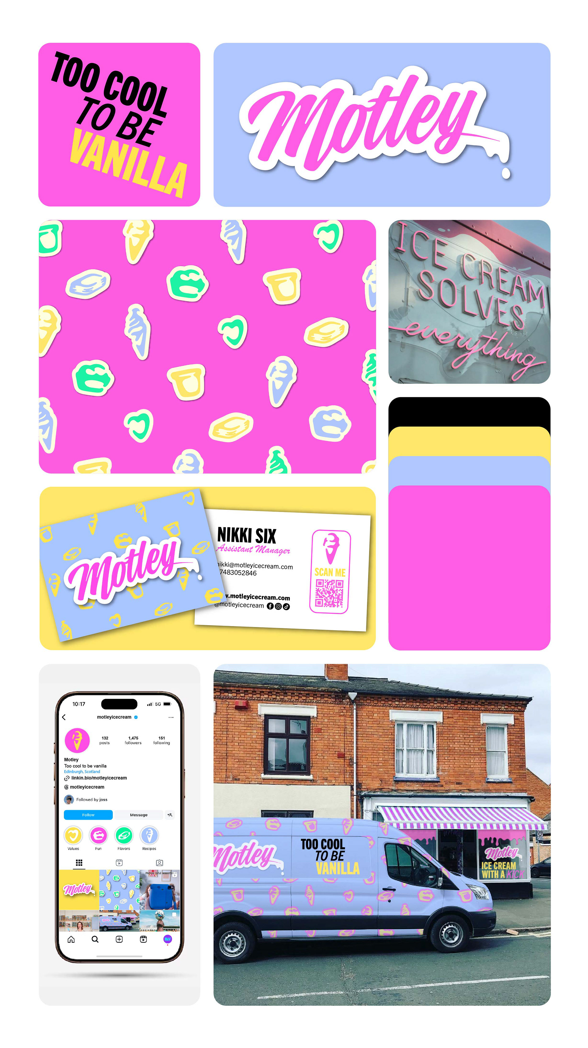 Motely is a bold, attitude-filled ice cream shop based in Brighton, taking inspiration from the glam rock spirit of Mötley Crüe. Known for its playful energy and bright pastel colours, the shop offers a fun, rebellious twist on the classic scoop.